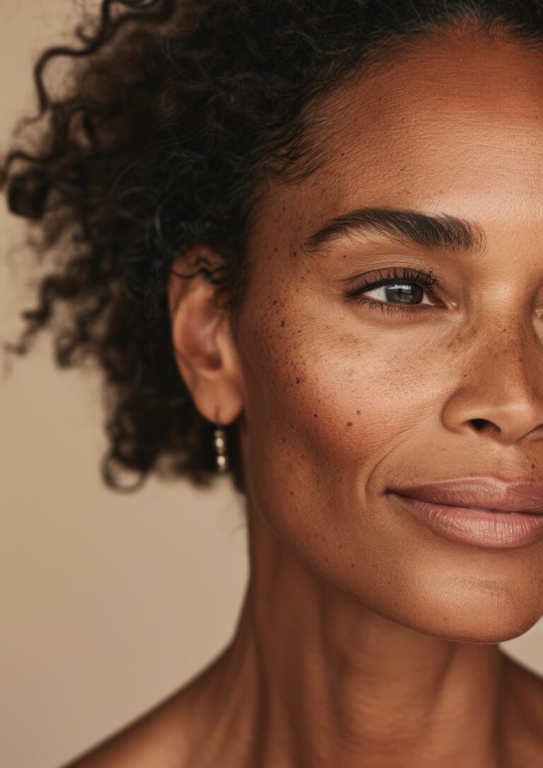 Collagen and elastin production slows, leading to skin that may feel thinner, drier, or less elastic. Oil production decreases too, leaving skin more prone to dryness and sensitivity. Changes in melanin levels can result in uneven pigmentation, including sunspots or patches of discolouration.